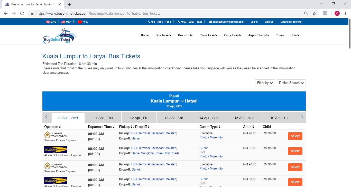 Setelah menyelidik, kami membuat keputusan untuk membeli tiket bas Alisan Golden Coach yang dijadualkan untuk berlepas pada pukul 11:00pm. Alisan ialah sebuah syarikat bas ekspres di Malaysia, dan ia juga terkenal dengan laluan Kuala Lumpur ke Hat Yai. Harga tiket adalah RM70.00 sehala untuk setiap penumpang, namun harga turut bergantung pada jenis bas yang anda pilih. Selepas kami membuat bayaran, kami menerima e-mel pengesahan tempahan daripada BusOnlineTicket.